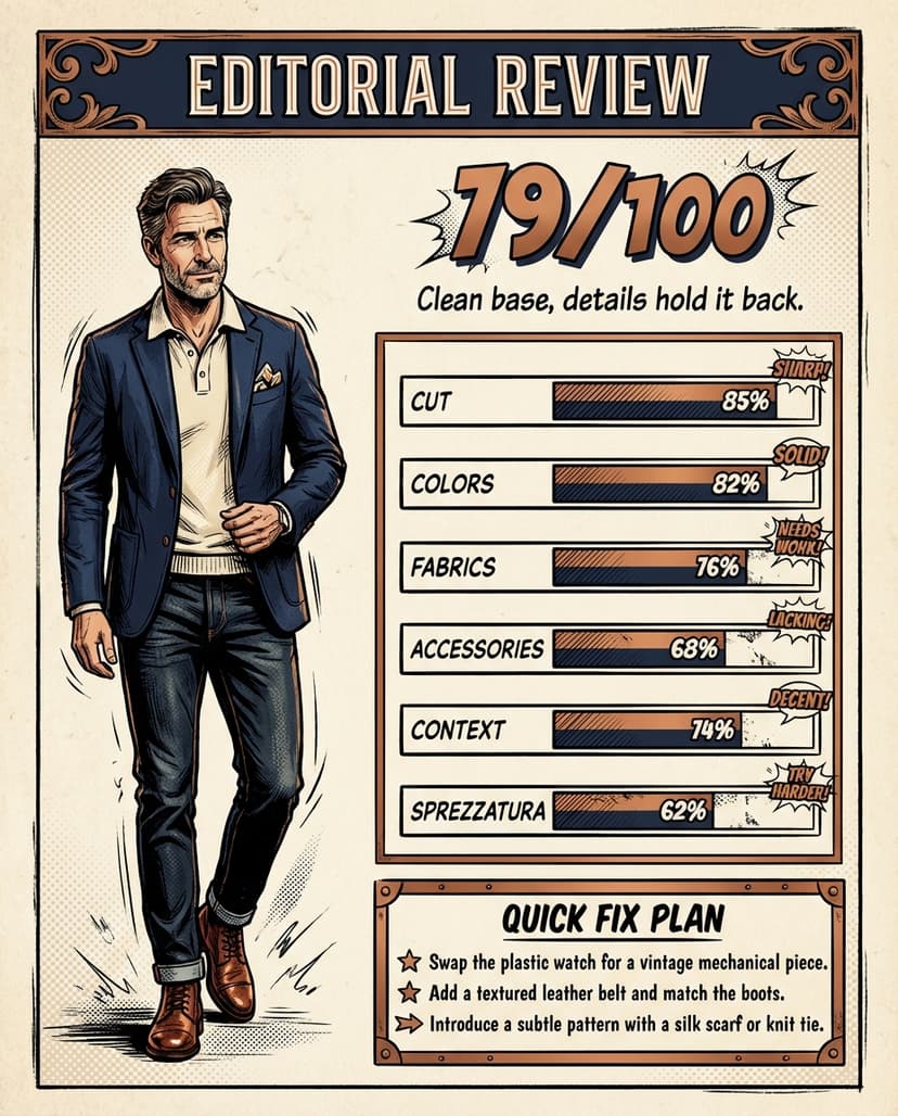 Sprezzatura breaks down your outfit across 6 criteria and explains why something works or doesn't. You leave with rules, not with "looks nice."